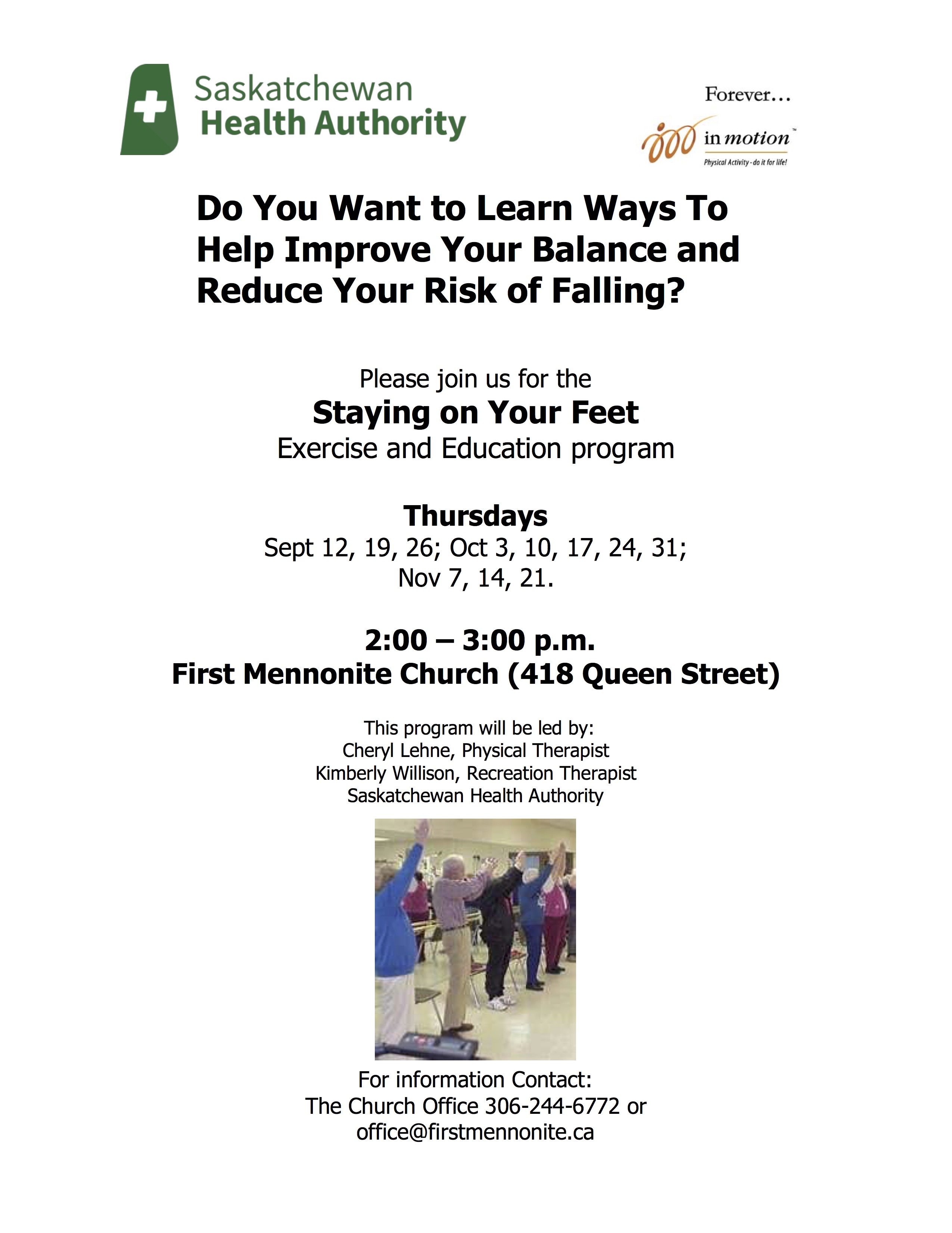 Check out another great fitness program organized through Saskatchewan Health Authority and First Mennonite Church (418 Queen St) right here in the community!
